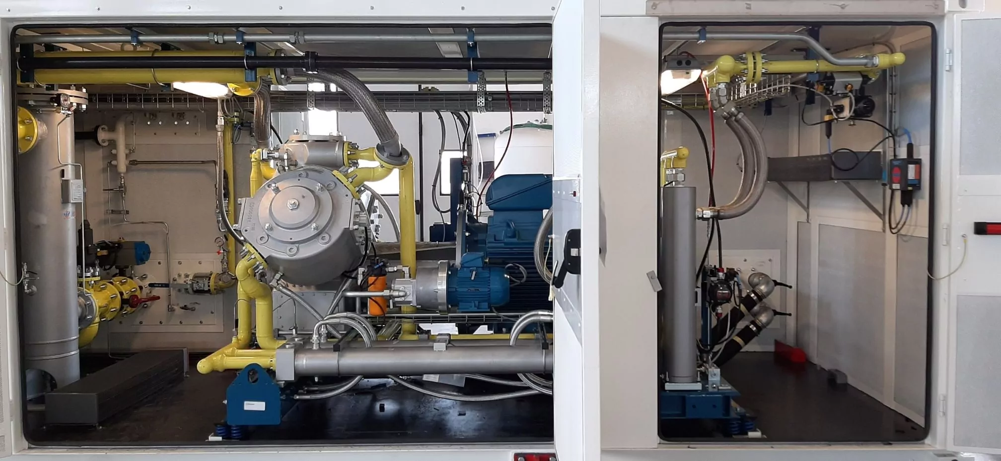 The developed solution represents one of the biomethane compression systems with the highest capacity and installed power per single compressor produced by SAFE. A soundproof and weatherproof Microbox M8 module was provided, inside which a SW compressor was installed with direct coupling to the electric motor in addition to the control panel compartment made in a safe area. A complete compression module for biomethane grid injection that allows flexible management of gas flow and enables integration within the biomethane production system.